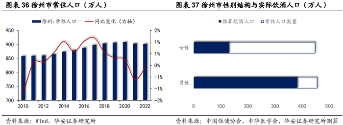 人口江苏第三,增长相对迟缓。徐州市为江苏省人口第三大市,仅次于苏州和南京,常住人口近年来维持在900万人以上,但增速相对南京/江苏较为缓慢,2021/2022连续两年出现下滑。作为苏北的龙头城市,在经济、科技、教育、医疗等各方面都处于领先地位,亦是苏北白酒市场的重点观察对象。截至2022年末,徐州市常住人口901.8万人,男女比例较为平衡,其中男性人口454.62万人、女性人口447.23万人(2022年数据),按照比例推算,苏州市实际饮酒人口约为513万人,对应人均年饮白酒量约为1110元。