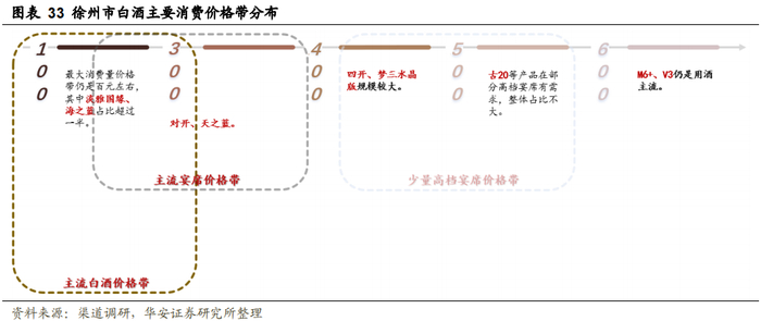 白酒“苏北化”之中有分化,地产品牌依旧强势。徐州地区作为苏北人口和经济的第一大市,在消费上同样具备规模优势,2022年,徐州市全年社零总额4103亿元,接近连云港、淮安、宿迁、盐城四市之和的60%。白酒消费价格带方面,徐州仍具备较强的苏北特质,一是整体价格带较苏南有较大差距,但由于经济相对领先,因此在宴席等场景也出现了一定高端化分化趋势;二是地产品牌强势,在主流的100-300元价格上,洋河、今世缘占比超过一半,草根调研同样显示,洋河、今世缘是徐州地区最受欢迎的两大品牌;三是消费者追求较苏南有所不同,徐州地区目前由追求价格到追求品牌阶段,而苏南地区则在品牌之上更加追求品质要求。具体来看: