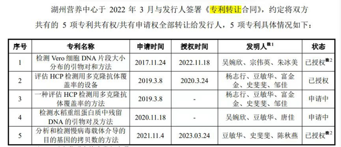 在2022年3月,湖州营养中心将检测 Vero 细胞 DNA 片段大小分布的引物对和方法、评估 HCP 检测用多克隆抗体覆盖率的设备、一种评估 HCP 检测用多克隆抗体覆盖率的方法、检测水稻重组蛋白质中残留DNA 的引物对及方法、分析和检测慢病毒载体介导的目的基因的拷贝数的方法等5项专利的50%权益,以71.42 万元卖给了申科生物。