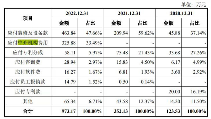 申科生物的“其他应付款”里,出现了一笔特殊的费用:2022年应付中介机构费用为325.88万元,占全年其他应收款的33.49%,而在往年,这笔费用为0元。这里的中介机构是谁?招股书没有公布。