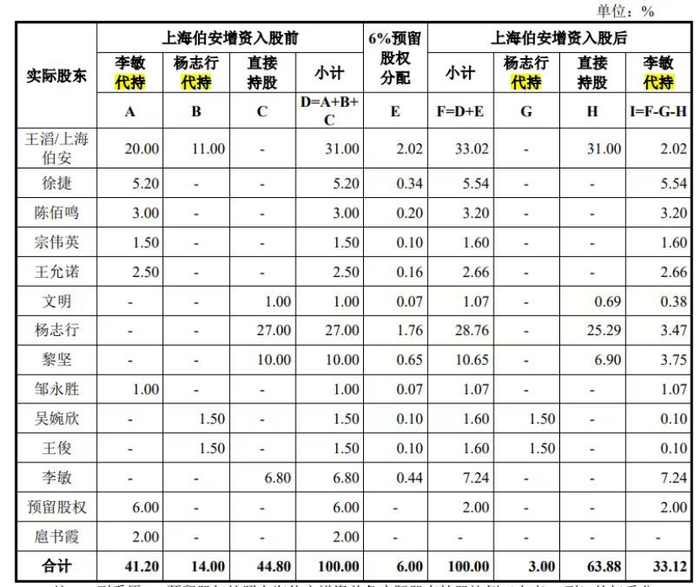 2012年5月,李敏进一步帮徐捷、陈佰鸣、王允诺、扈书霞、童瑞和宗伟英等6人代持了股份,令其名义上持股升至41%。此前,童瑞离职,个人持有2%股权有由李敏继续持有并预留。