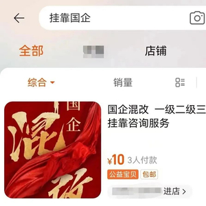 在电商平台上,可以轻松搜到这样提供挂靠国企服务的中介。中新财经记者在知名电商平台上搜索关键词“挂靠国企”,排在第一位的就是可以提供“国企混改 一级二级三级四级挂靠咨询服务”的店铺。