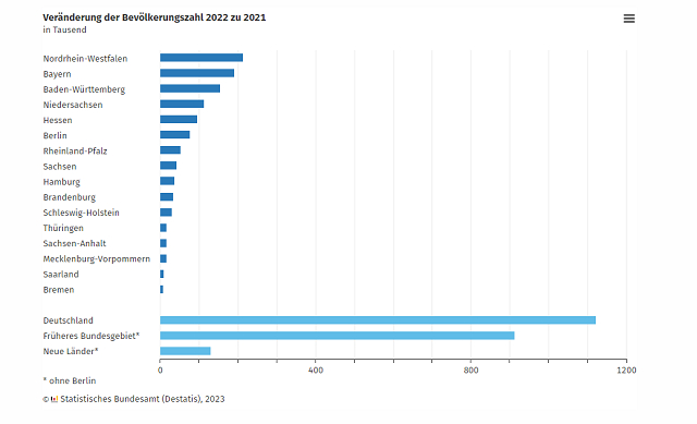 数据显示,2022年,德国人口增长了1.3%(1122000人),而2021年仅增长了0.1%(82000人)。到2022年底,德国人口达到8440万,德国联邦统计局表示,这主要是由于来自乌克兰的难民潮导致净移民人数大幅增加。