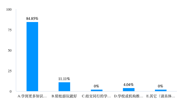 就研学游调研,第一财经记者通过网络问卷形式收集了约300份问卷,调查结果显示,84.85%的受访者希望通过研学游学到更多知识,轻松玩乐并不是消费者最看重的。其中79.8%的受访者希望通过研学游学习到历史文化类的知识。