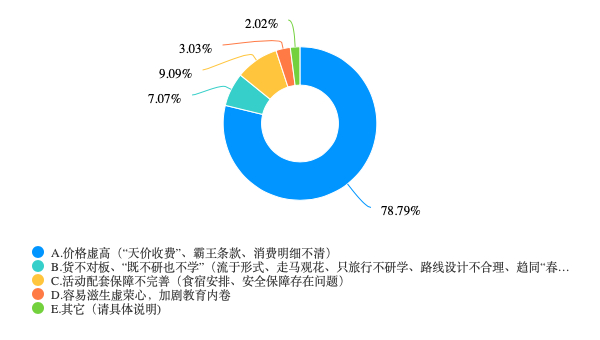 调研显示,78.79%的受访者认为研学游价格虚高,有些消费明细不清,此外货不对板,游而不学也是比较突出的问题。