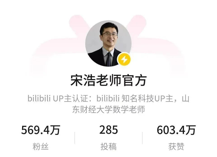 现在打开B站,搜索“高等数学”“微积分”“线性代数”“概率论与数理统计”,排名第一的都是宋浩的课。今年5月,B站公布累计播放时长最高的10条视频,宋浩的《高等数学》以超过1亿的播放量,稳居第1;前5条中,他的《线性代数》《概率论与数理统计》以4907万、3338万名列第三、第五,独占半壁江山。