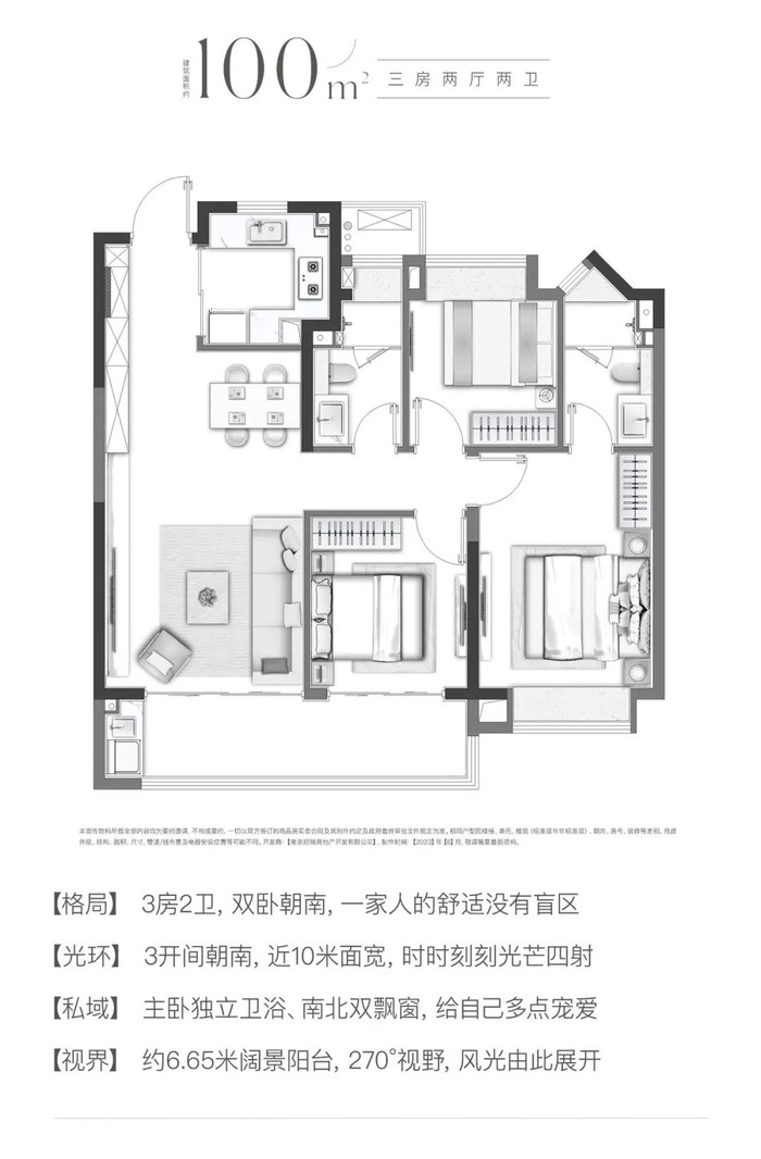 建面约100㎡三房两厅两卫户型:三开间朝南、南向超大双阳台、全屋四飘窗,功能性很强。区域罕见小户型,不仅控制了上车门槛,而且整体得房率较高。