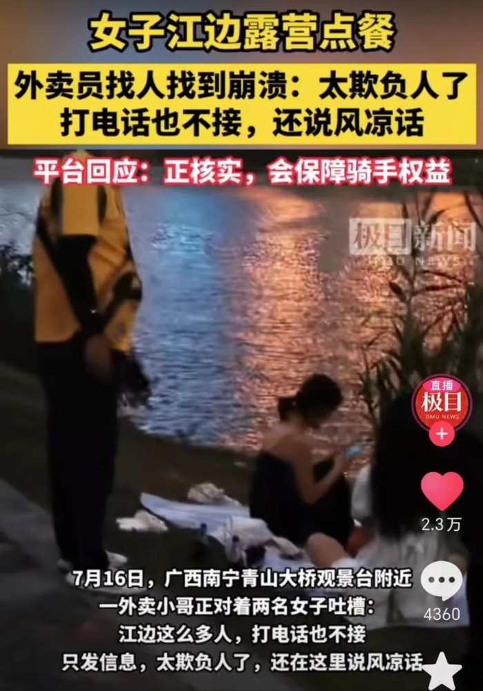 夏天炎热,她们在江边游玩累了知道休息,饿了渴了知道点餐,却从未想过外卖小哥一遍遍打不通电话和找不到人时,内心又该是何等的焦急和绝望。
