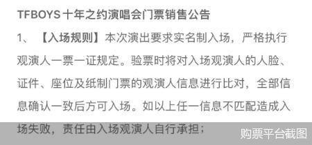 购票平台显示,“TFBOYS十年之约”演唱会不支持自主选座、要求实名制入场,执行观演人一票一证规定。验票时将对入场观演人的人脸、证件、座位及纸制门票的观演人信息进行比对,全部信息确认一致后方可入场。同时,平台实名购票后,所购门票不支持转赠与转售。