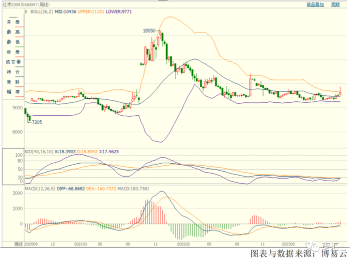 郑枣主力2309合约,周五收盘报10930元/吨,周内期价下跌380元/吨,持仓量48267手,较上周减少1891手。技术上,周线收于布林通道中轨只上,MACD红色能量柱放量,KDJ指标在零轴下方粘合。