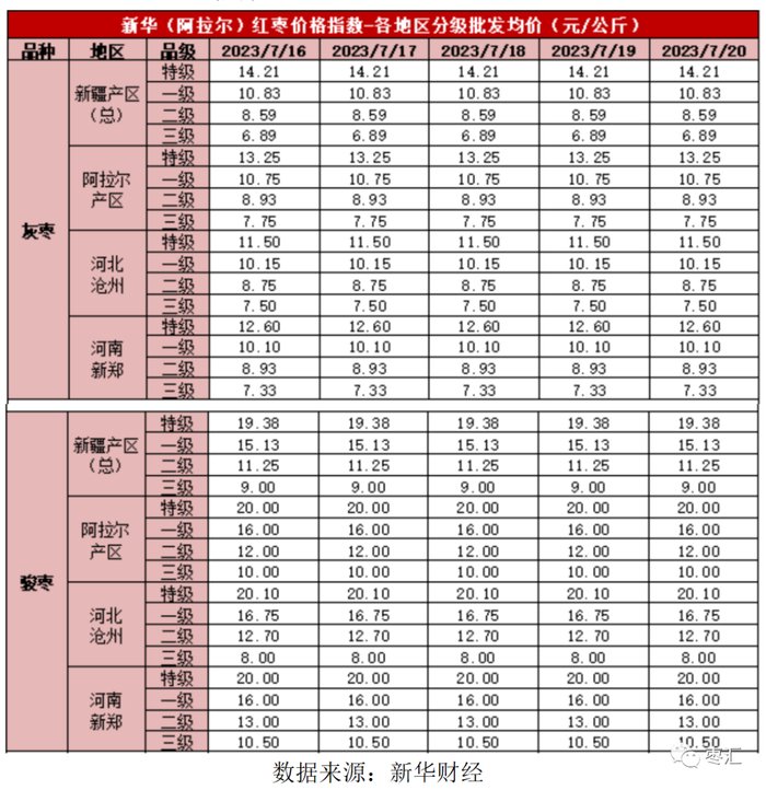 截至7月20日,新华(阿拉尔)红枣价格指数报857.02点,周环比微幅下跌0.20%,分地区看,新疆产区红枣价格指数周环比下跌0.25%,批发市场红枣价格指数周环比下跌0.18%。