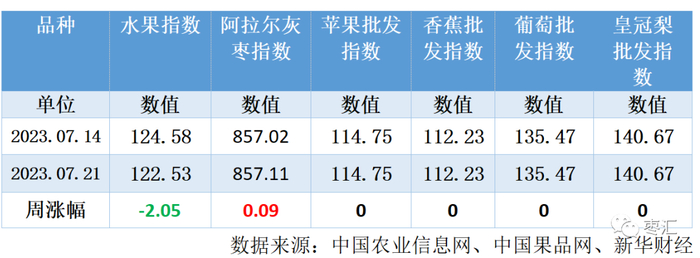 水果指数较上周相比小幅下调;灰枣指数较上周微幅上调;香蕉批发指数较上周持平;苹果批发指数本周较上周持平;葡萄批发指数较上周持平;皇冠梨批发指数较上周持平。
