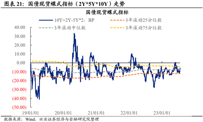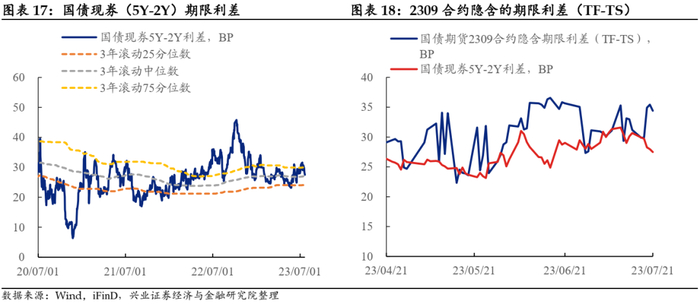 近两周,现券10Y-2Y,5Y-2Y利差压缩,10Y-5Y利差先收窄后走阔,30Y-10Y利差在37.5BP附近波动,变化不大。税期资金不紧+市场交易降准预期,短端表现较好(1Y国债收益率明显下行,但2Y国债收益率变化不大)。基本面和政策对长端的利空有限,长端做多力量较为积极,10Y和30Y收益率明显下行。现券10Y-2Y压缩至49BP附近,处于3年滚动75分位数下方;现券5Y-2Y利差压缩至27.5BP,处于3年滚动中位数附近;10Y-5Y利差先收窄后走阔至21.6BP附近,处于3年滚动75分位数下方。30Y-10Y利差先收窄后走阔,整体变化不大,绝对水平在37.5BP附近,仍然处于历史偏低位置。期货隐含的期限利差则由于CTD券切换的因素波动有所放大。但大部分期货隐含的期限利差整体走势与现券一致。