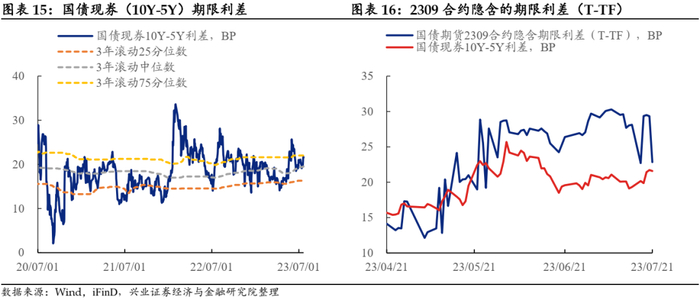 2)TL2309的CTD券为30年的老券,近期30年老券出现补涨行情,30年新老券利差明显压缩,这意味着即使基差不变,TL2309也会由于30年老券更大的收益率下行幅度而出现超涨。7月以来,TL2309的CTD券主要在210014.IB和220008.IB两支30年老券中切换(而T2309的CTD券则为今年发行的新券)。近两周这两支30年老券下行了约6BP,与30年新券的利差明显压缩。TL2309的基差先收窄后走阔,整体变化不大。因此TL2309超涨的背后有30年老券补涨的推动。