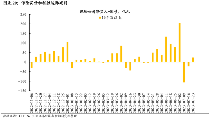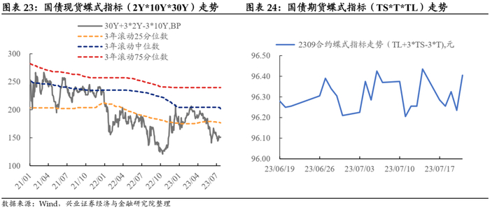 1)30年国债现券表现不弱,且由于久期较长,同样的收益率下行幅度,30年现券价格的上涨幅度会高于10年期品种。近2周,30年和10年国债收益率均下行了约3BP,但由于30年久期更长,价格上的涨幅高于10年品种(近2周10年国债新券230012.IB净价上涨0.28元,而30年国债新券230009.IB净价上涨0.62元)。