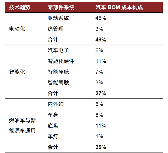电动智能技术变革,中国技术创新弯道超车。在电动智能趋势下,汽车的产品形态和核心价值发生巨大变化,三电系统取代传统动力总成,智能化功能向更优质的智能座舱体验和更高级的自动驾驶升级。图表15.7显示,我们拆分智能电动车的BOM成本发现,电动化和智能化相关零部件的价值占比超过70%,传统燃油车高价值量的“发动机+变速箱”动力系统不复存在。燃油车时代的技术壁垒被打破,中国在电动智能化领域的产业链地位和竞争优势明显提升,也为自主品牌实现品牌向上提供可能。