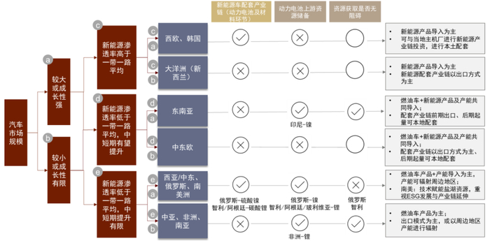 中国汽车特别是新能源汽车产业,有望在“一带一路”倡议中扮演重要角色,打造产业链出海的集群效应,发挥全产业的规模和技术优势,实现产品、品牌、技术、人才的全方位出海。我们建议中国企业针对带路国家的经济阶段、发展需求及资源禀赋,因地制宜地制定和执行汽车出海方略。