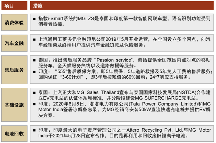 以上汽集团为例,其之所以成为中国出口量最大的汽车集团(2022年中汽协数据显示),就在于除了海外产能布局之外,还设立了本地化研发中心、拓展营销服务网络、完善售后服务及补能基础设施、采用差异化的本土战略,实现了从产品到服务的全方位体系化出海。目前,上汽集团的海外产能布局集中在东南亚及南亚地区,分别在泰国、印尼、印度和巴基斯坦建立了4个生产基地及KD工厂;在欧美日布局了3个创新研发中心和3个设计中心;在欧洲、南美、西亚、北非、澳新、东盟,建立了区域化营销服务中心超1800家,并且打造了维修保养、金融贷款、充电基建等本土化售后服务。此外,公司还基于旗下自有物流公司安吉物流,开通了东南亚、墨西哥、南美西、欧洲等7条自营国际航线支撑供应链管理。最后,公司深入推进人才本土化,西亚、印度、泰国等地团队大量吸纳本土人才,来开发满足本土需求的产品、消费体验和服务。