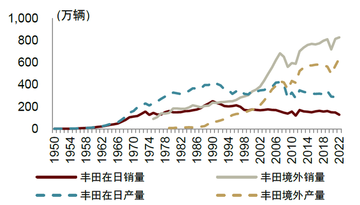 丰田汽车经历了典型的从“产品出口”到“产业链出海”的完整转型。20世纪70年代,石油危机爆发,日本经济增速放缓、新车销量增速放缓,丰田加大出口力度、寻求海外市场突破,1970-1980年出口销量CAGR达到14.0%。到了20世纪80年代,由于美日贸易摩擦,日本政府签订《美日自愿出口协议》主动限制汽车出口,叠加日元持续升值,“产品出口”遇到瓶颈和困境。经过一系列的战略调整,丰田汽车加快了海外生产基地建设,并设立区域性本土化的技术研发、销售渠道、供应链管理中心,1980-2022年期间丰田汽车境外产量的CAGR达到10.8%,截至2022年丰田海外产销占总产销的70.6%/86.5%,国际化成效显著,完成“产业链出海”。