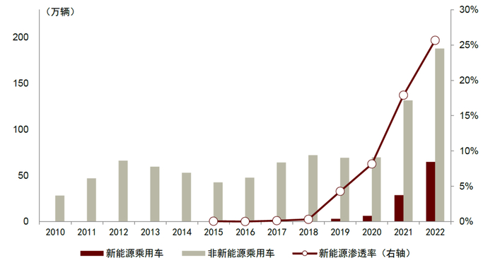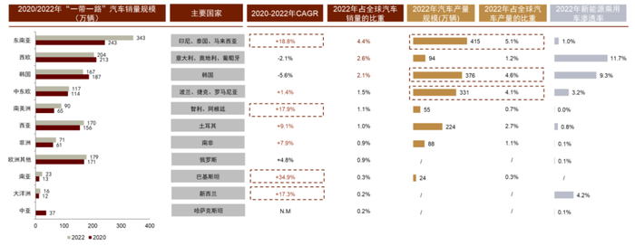 注:Marklines数据库并未覆盖所有带路国家,我们筛选出其覆盖的带路国家进行匹配;“欧洲其他”、“西亚”分类下部分国家2022年产量/销量/新能源渗透数据缺失,以2021年产量/销量/新能源渗透数据代替;“中亚”以2020年产量/销量/新能源渗透数据代替。