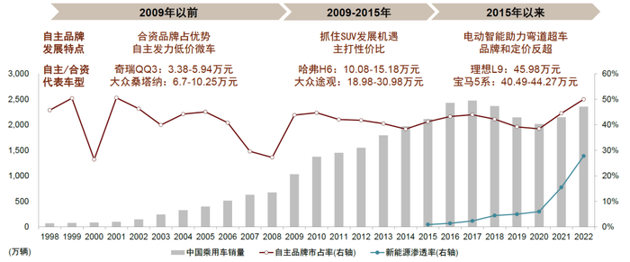 复盘我国乘用车的发展历程,竞争格局长期以合资车企或者外资品牌为主导。由于合资模式的技术导入和国产程度相对有限,中国汽车核心技术和制造能力的自主积累过程比较漫长,导致竞争的落后地位。如图表15.4所示,随着中国自主车企经历了“低价打开微车市场”(建国以来至2009年)、“高性价比发力SUV”(2009-2015年)、“电动智能助力弯道超车”(2015年以来至今)的三个阶段后,中国正加速从汽车大国向汽车强国转变,带路经济的汽车产业输出有望加速这一进程。