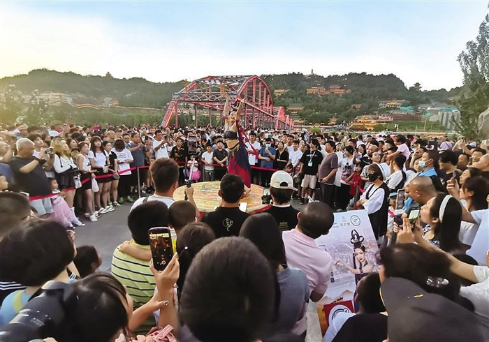 图为中山桥前的敦煌舞表演引游客围观。