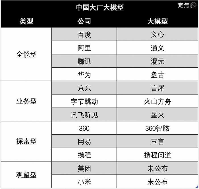 根据资源能力、布局深度、出招套路,大厂的大模型可以分为不同的流派。「定焦」将它们总结为四大类型: