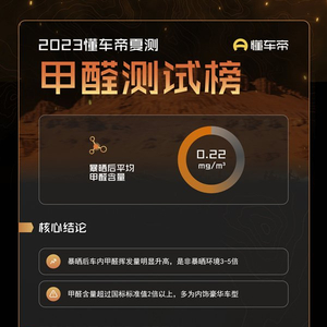 经过暴晒后,车辆平均甲醛含量为0.22mg/m ,核心结论为:暴晒后车内甲醛挥发量明显升高,是非暴晒环境3-5倍;甲醛含量超过国标标准值2倍以上,多为内饰豪华车型。