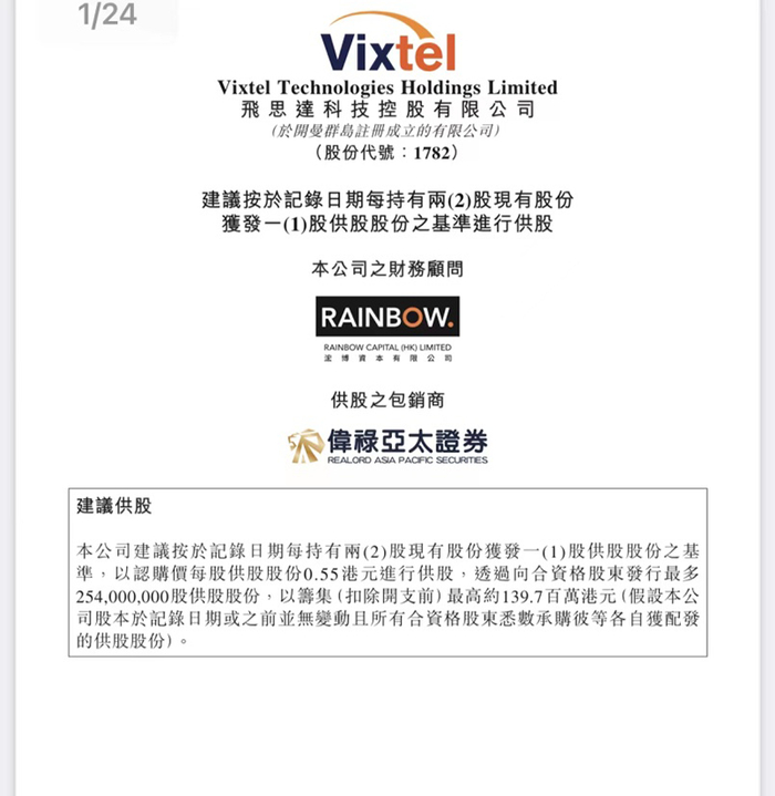 此外,2022年年报显示,2022年6月,该公司完成了一次供股集资。据4月22日公告显示,飞思达科技向合资格股东发行最多2.54亿股供股股份,筹资约1.4亿港元(扣除开支前)。供股股价为0.55港元/股,较4月21日收盘价折让约34.5%。