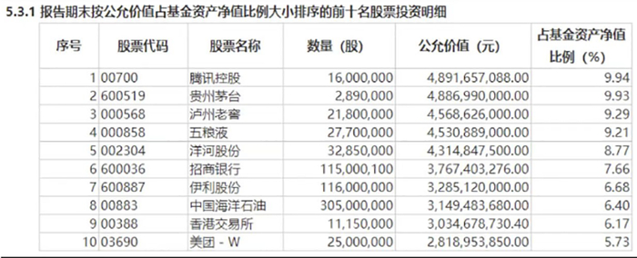 7月20日,张坤管理规模最大的易方达蓝筹精选二季报出炉,该基金在二季度股票仓位基本稳定,并对结构进行了调整。增加了消费等行业的配置,降低了科技等行业的配置。前十大重仓股分别是腾讯控股、贵州茅台、泸州老窖、五粮液、洋河股份、招商银行、伊利股份、中国海洋石油、香港交易所、美团。其中,腾讯控股和贵州茅台占基金资产净值比例都超过了9.9%,几乎顶格持有。