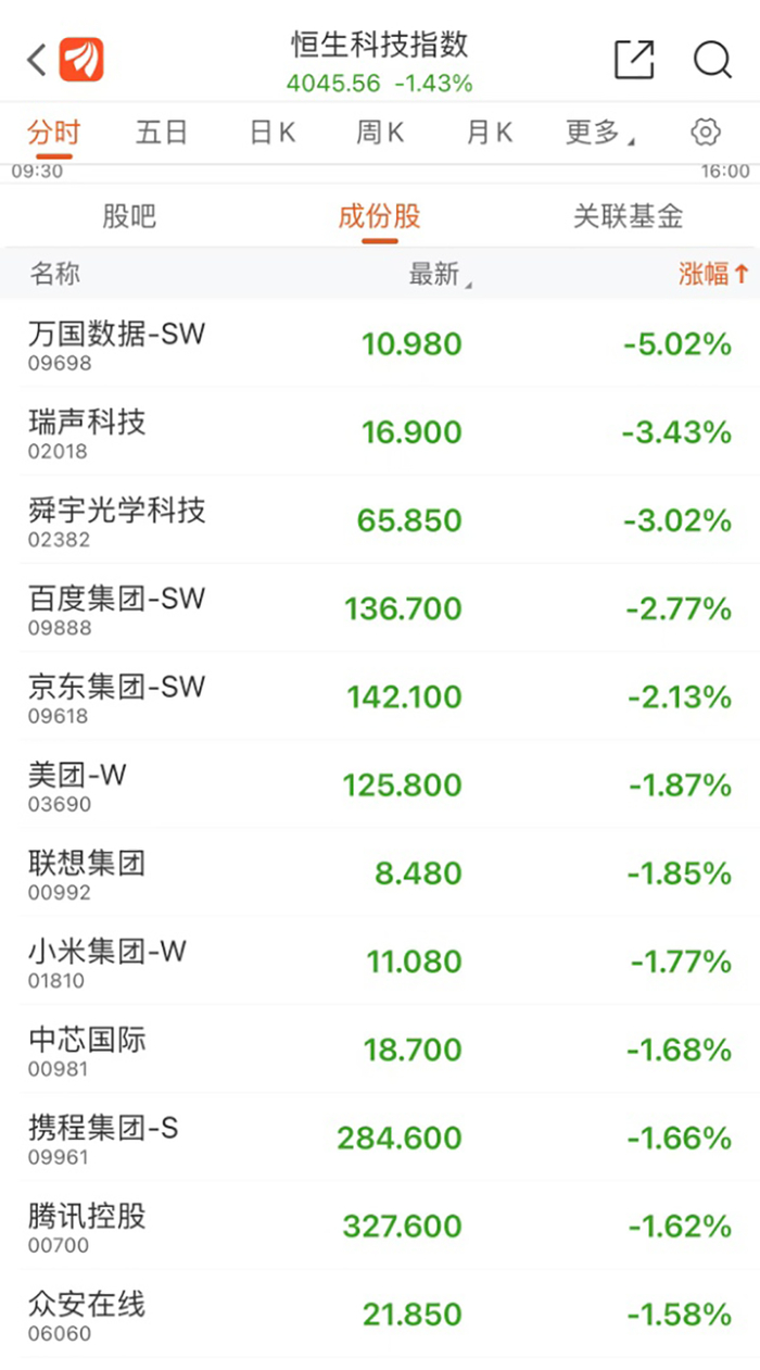 今日早盘,恒生科技指数成分股仍延续颓势。截至发稿,万国数据-SW跌超5%,瑞声科技跌超3%,百度集团-SW跌超2%,腾讯控股跌近2%。