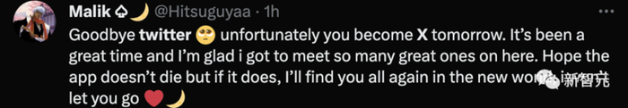 “再见了,推特,不幸的是,明天你就变成X了。这是一段美好的时光,我很高兴能在这里认识这么多好朋友。希望这个应用程序不会消亡,但如果真的消亡了,我会在新世界里再找到你们。我不会让你们离开的。”
