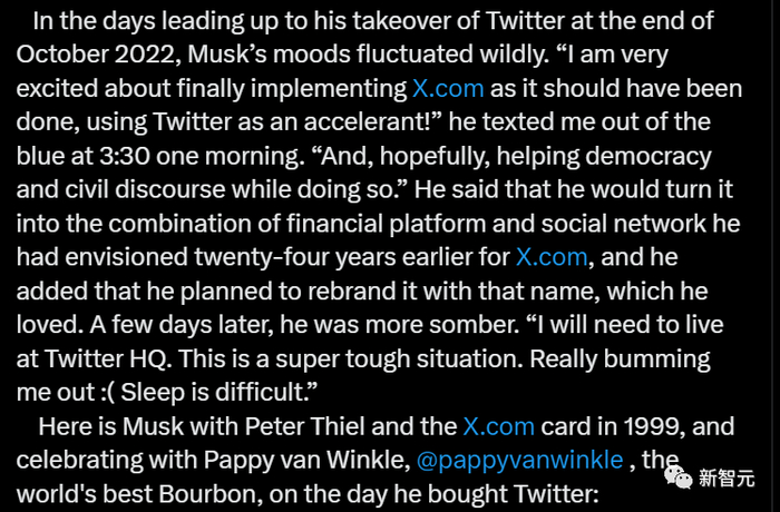 在2022年10月底接管推特之前的几天里,马斯克的情绪波动很大。一天早上3点30分,他突然给我发了短信,“我非常兴奋,因为我终于可以用推特作为助推器,按部就班地实施X.com了。而且,希望在这样做的同时,还能帮助民主和文明对话”。他说,他会把推特变成24年前为X.com设想的金融和社交网络的结合体。他补充道,他计划用他喜欢的那个名字重新命名推特。几天后,他情绪更加低落了。“我需要住在推特总部。这是一个非常艰难的情况。真的让我很沮丧,睡眠很困难。”