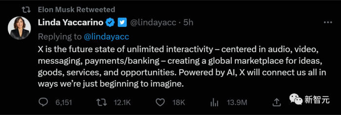 与此同时,推特新任CEO Linda Yaccarino也正式宣布:“X是无限交互的未来形态——以音频、视频、消息、支付/银行为中心——创建一个创意、商品、服务和机会的全球市场。在人工智能的支持下,X将会连接我们所有人,在这方面,我们才刚刚处于想象的起点。”
