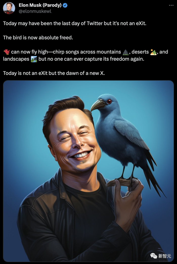 “今天可能是‘推特’的最后一天,但这并不是‘eXit’。鸟儿现在绝对自由了。现在,它可以高鸣着飞越高山、沙漠和各种景观,但再也没有人能捕捉到它的自由。今天不是‘eXit’,而是新X的黎明。”