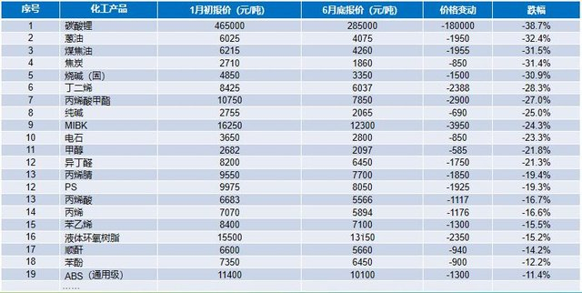 其中,碳酸锂、煤焦油、焦炭、烧碱等化工品跌幅超30%;丁二烯、纯碱、MIBK、甲醇、异丁醛等化工品跌幅超过20%;丙烯、顺酐、苯酚、ABS等30多种化工品跌幅超过10%。以液体环氧树脂为例,2021年11月,其报价达到41000元/吨;2023年6月,报价却仅为13150元/吨,呈断崖式下跌。