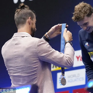 如今,当年轻的马尔尚以相似的方式横空出世后,已经蓄起胡须、扎着丸子头的菲尔普斯也忍不住起身为马尔尚鼓掌,更是在颁奖仪式上把这位年轻小将的手臂高高举起。