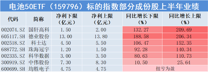 国轩高科预计2023年上半年归母净利润1.50-2.00亿元,同比增长132%-210%,位列当前电池50ETF(159796)标的指数成份股业绩榜首。
