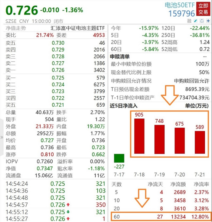 新能源核心赛道持续调整,电池50ETF(159796)七连阴,资金逆行增仓,此前4日连续吸金超2900万元!