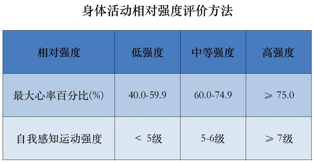通过个体主观用力和疲劳感的程度来判断身体活动的强度,可采用0-10级自我感知运动强度量表测量。0级:休息状态,1-2级:感觉弱或很弱,3-4级:感觉温和,5-6级:中等,7-8级:疲惫感,9-10级:非常疲惫。