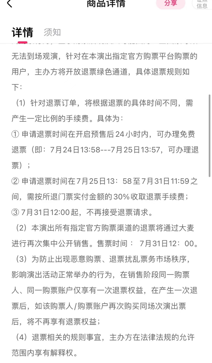 从大麦售票界面来看,TFBOYS十周年演唱会实施了像高铁一样的阶梯退票办法,针对退票订单,将根据退票的具体时间不同,产生一定比例的手续费。24小时内免费,超出24小时收取30%手续费,31日止停止退票。