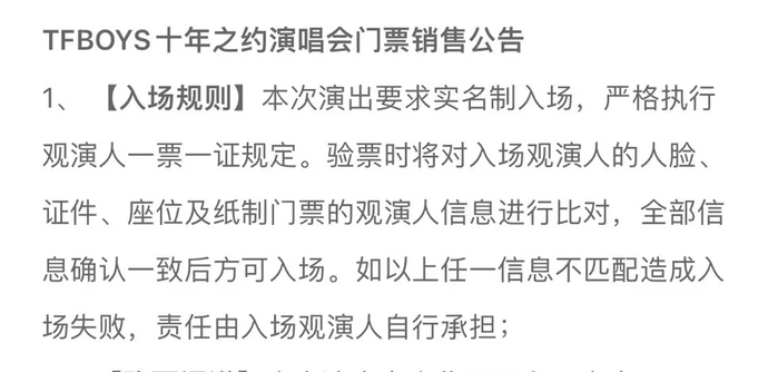此次掀起代抢风潮的其中一个原因是“强实名”。根据大麦平台规则,TFBOYS十周年演唱会严格执一票一证规定,验票是将对入场观演人的人脸、证件、座位及纸质门票观演人信息对比验证,完全一致方可入场。现场将有闸机验证人脸。如有特殊因素导致无法到场观演,主办方开启退票绿色通道。