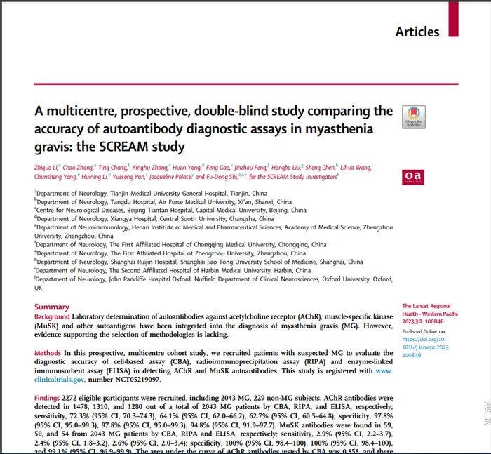 北京天坛医院/天津医科大学总医院施福东团队自主研发基于细胞的抗体检测新技术,产生了重症肌无力全球首个I级方法学推荐证据。近日,这项成果在国际知名医学期刊《柳叶刀-区域健康(西太平洋)》上发表。
