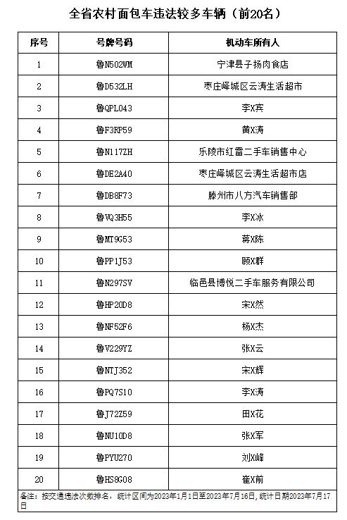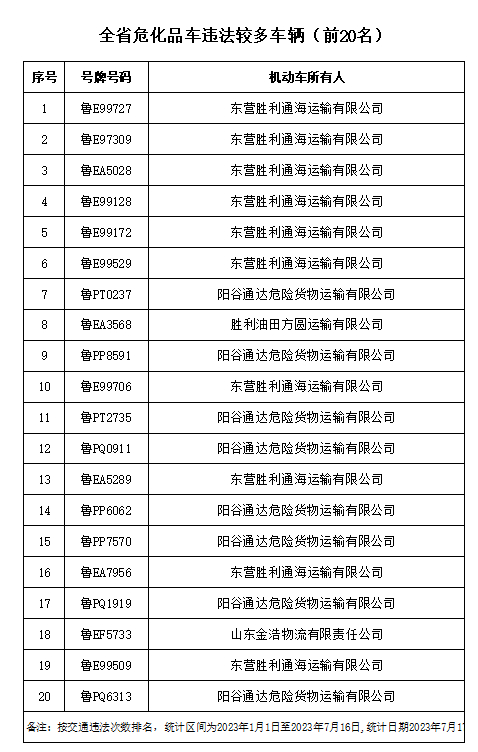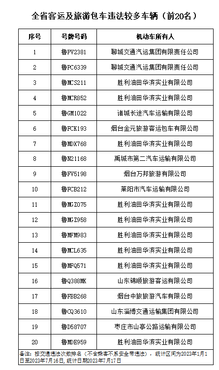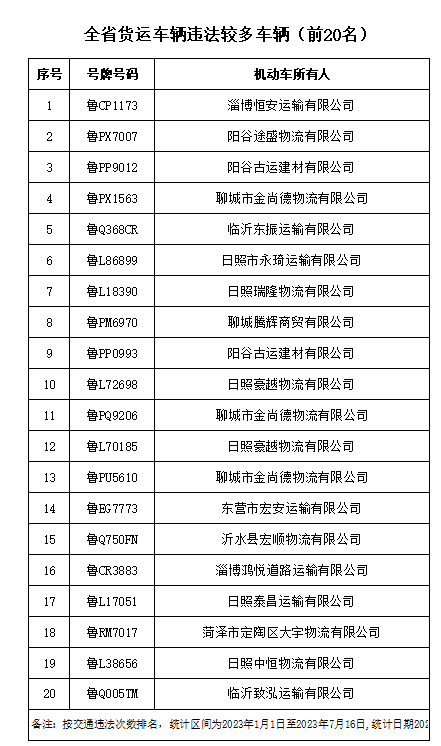 近日,山东省公安厅交通管理局发布7月份重点交通违法企业、车辆及驾驶人名单,此次曝光的交通违法次数较多的“两客一危一货”车辆共计60辆,违法车辆占比较高的“两客一危一货”运输企业共计60家,违法较多的农村面包车驾驶人20人,终生禁驾人员38人,同时发布了一批典型案例和事故多发路段。