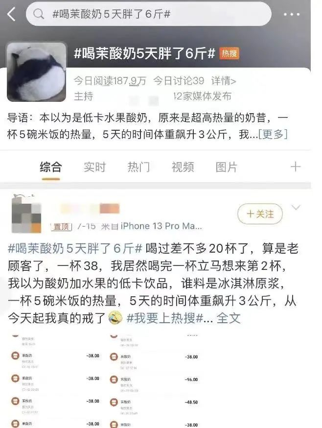 还有网友分享道,以为是酸奶加水果的低卡饮品,谁料是冰淇淋原浆,喝茉酸奶5天的时间,体重飙升3公斤。