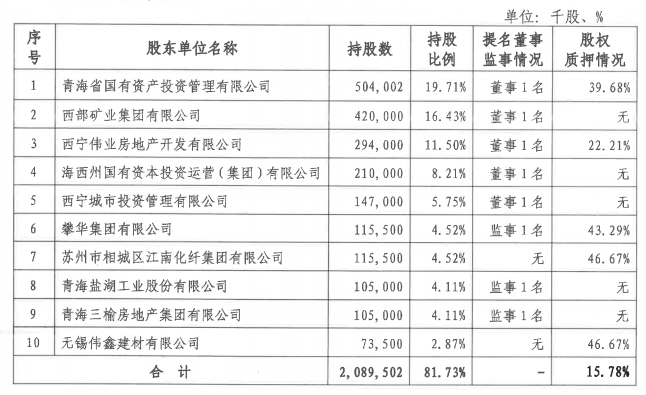 此外,西部矿业集团有限公司为该行第二大股东,持股数量4.2亿股,持股比例16.43%;西宁伟业为该行第三大股东,持股数量2.94亿股,持股比例11.5%。