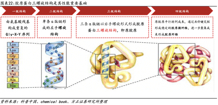 关键特性三螺旋结构决定胶原蛋白性能。胶原蛋白合成经历四级过程。从结构来看,胶原蛋白通过三条α肽链以右手螺旋形式形成三螺旋结构,从而具备高拉伸强度、生物降解性能、低抗原活性、低刺激性、低细胞毒性。因此,三螺旋结构是其性能重要基础。