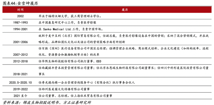 高管团队大多具备医药相关背景。董事长杨霞曾任山西医科大学讲师。公司董事、总经理金雪坤曾任华熙生物科技股份有限公司执行董事、CEO和四川中科形美医院投资有限公司董事长等。董事、副总经理陆晨阳曾任华北制药集团山西博康药业有限公司总工程师、副总经理,董事、副总经理李万程曾任锦波有限副总经理、销售总监。