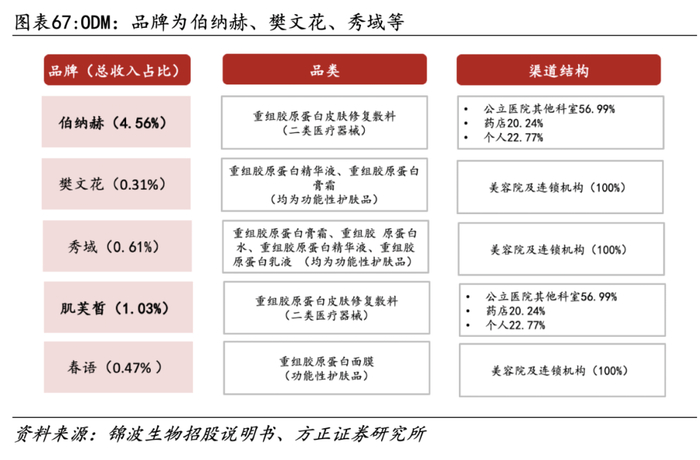 ODM品牌为伯纳赫、肌芙皙、秀域等。其中伯纳赫在公司总营收占比最高,2022年,品牌收入占总收入比例达4.56%,其次为肌芙皙,占总收入比例比超过1%。