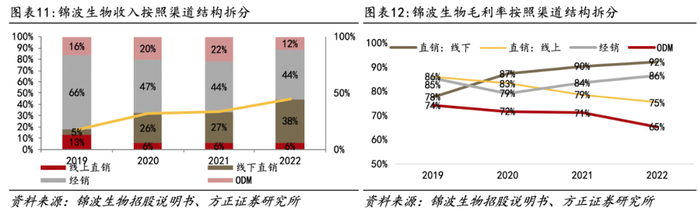 渠道拆分:采用OBM+ODM模式,自有品牌推广推动直销占比上升至38%。公司采用OBM和ODM两种销售模式,其中OBM占主导地位,2022年占比为88.1%(+10.4pct),其中线下直销比例逐年增加,2022年占比达38%(+11pct)。渠道结构变化主要系产品结构变化带动(植入剂以线下直销为主)。